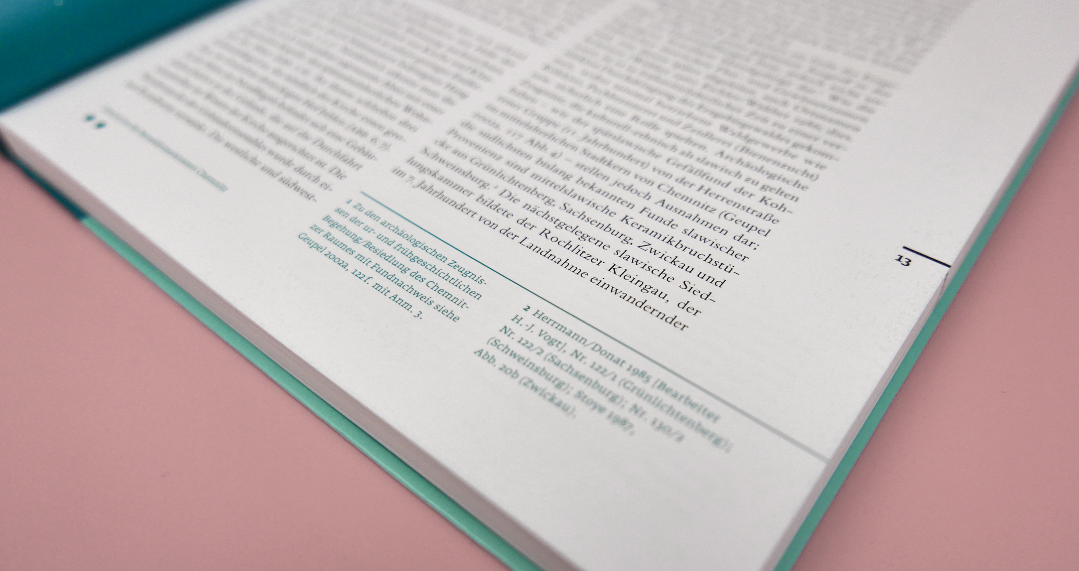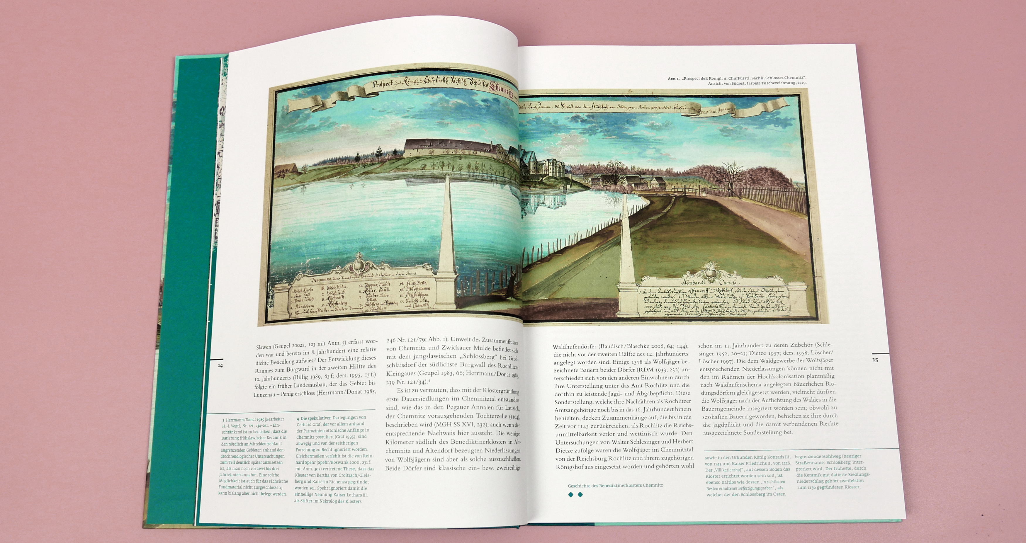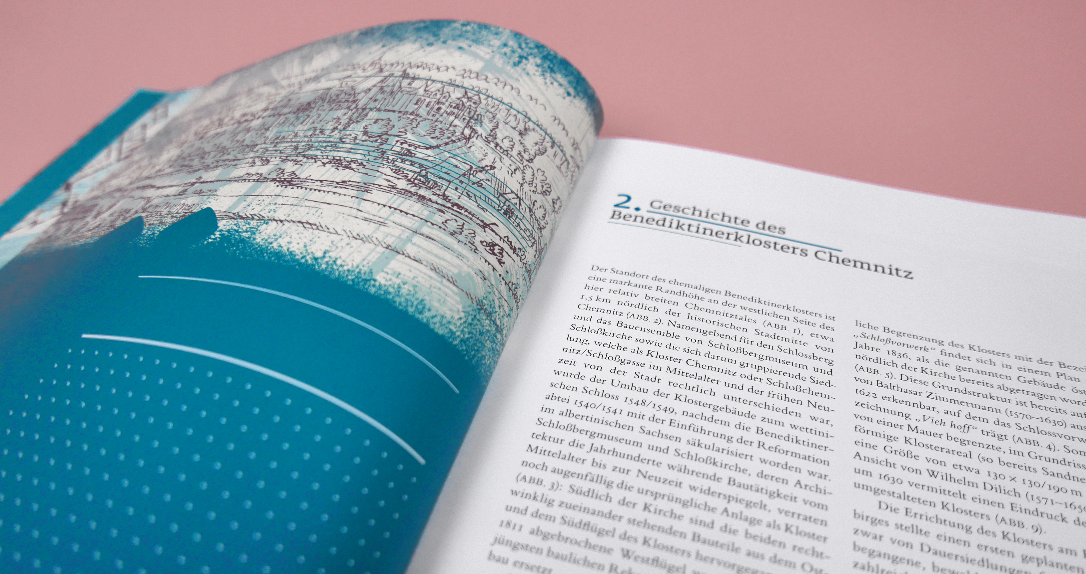 Anlässlich des Chemnitzer Stadtjubiläums 2018 wurden mit diesem Buchprojekt die Grabungen im ehemaligen Benediktinerkloster vorgestellt. Die darin enthaltenen wissenschaftlichen Auswertungen stellen einen wichtigen Beitrag zur Stadtgeschichte dar. Mit klarem Satz, dezenten grafischen Elementen und feinen Details wie z. B. den petrolfarbenen springenden Fußnoten genügt die Gestaltung den Anforderungen wissenschaftlicher Strenge und erweckt gleichzeitig das Interesse eines breiteren Publikums. Hardcover, Vorsatzpapier Surbalin, Format 21,5/28,5cm, 168 Seiten.