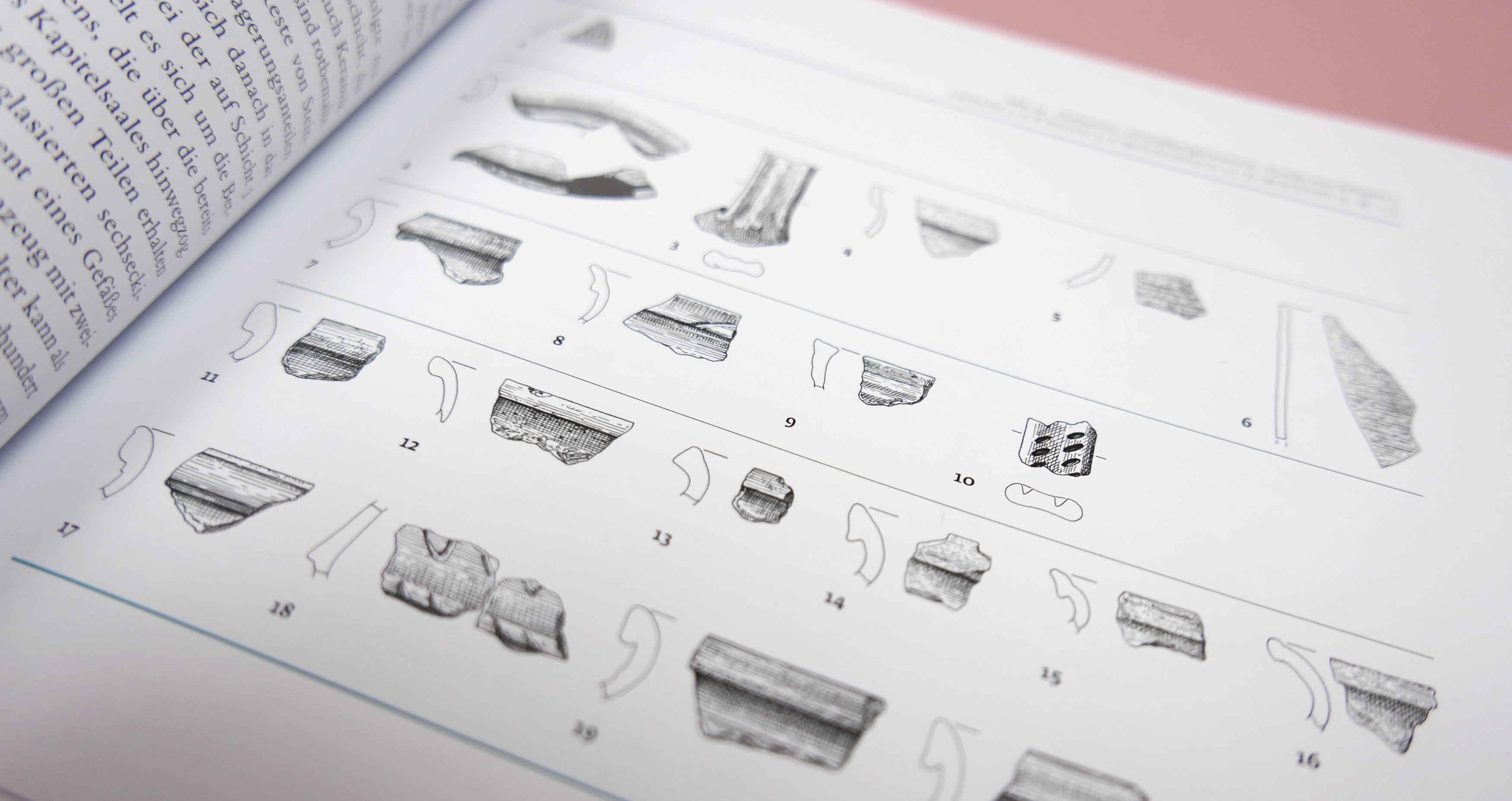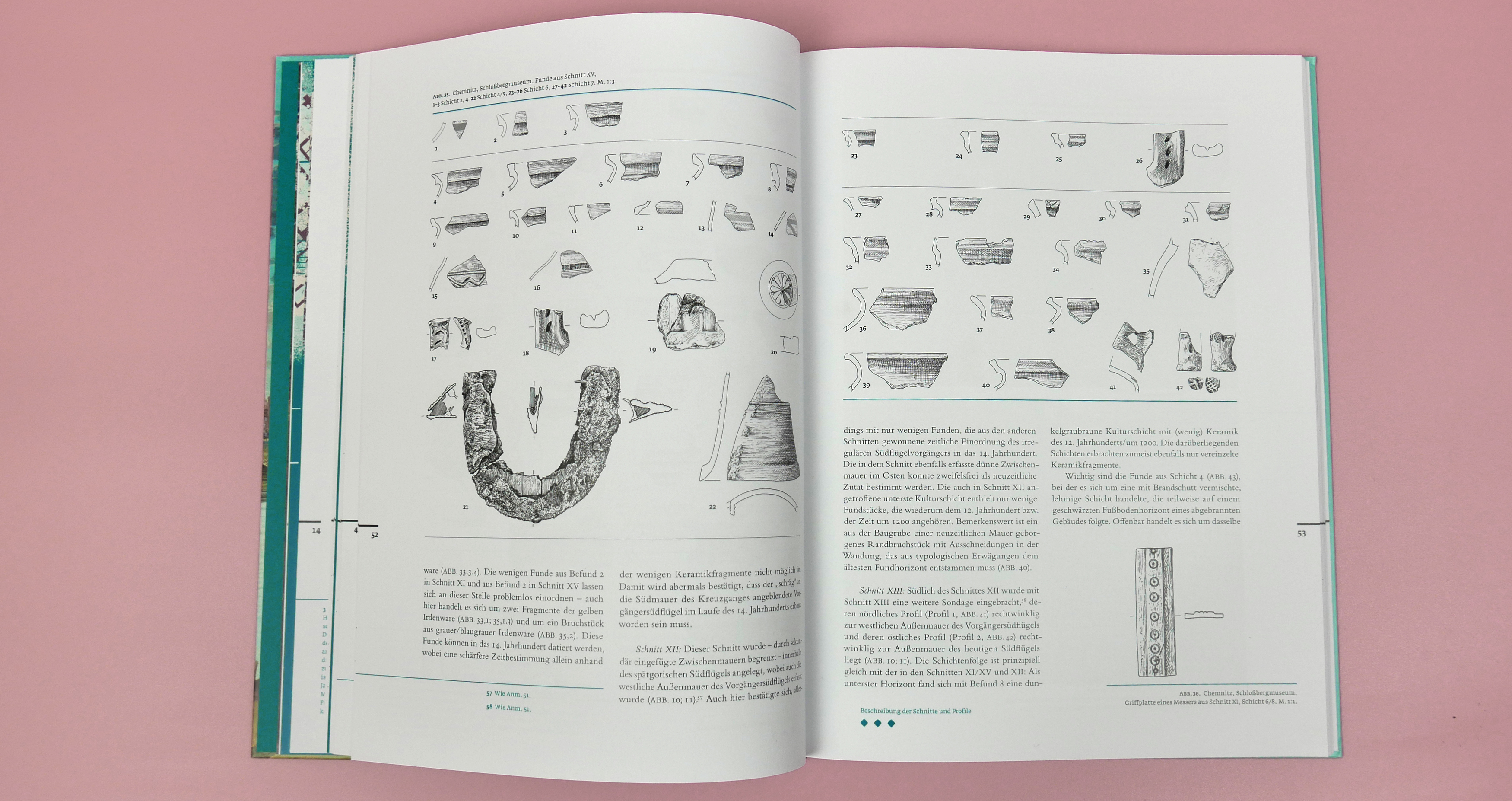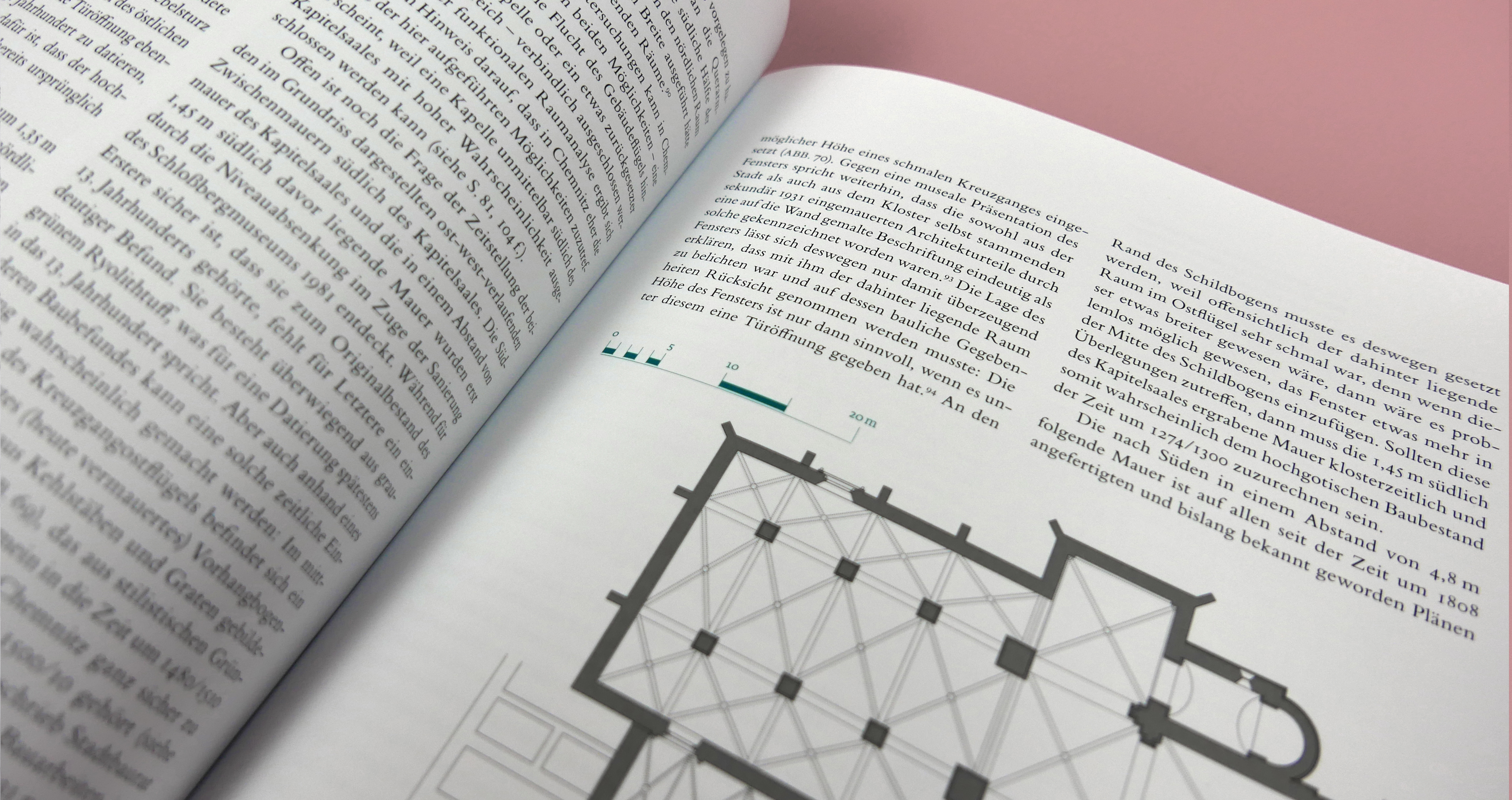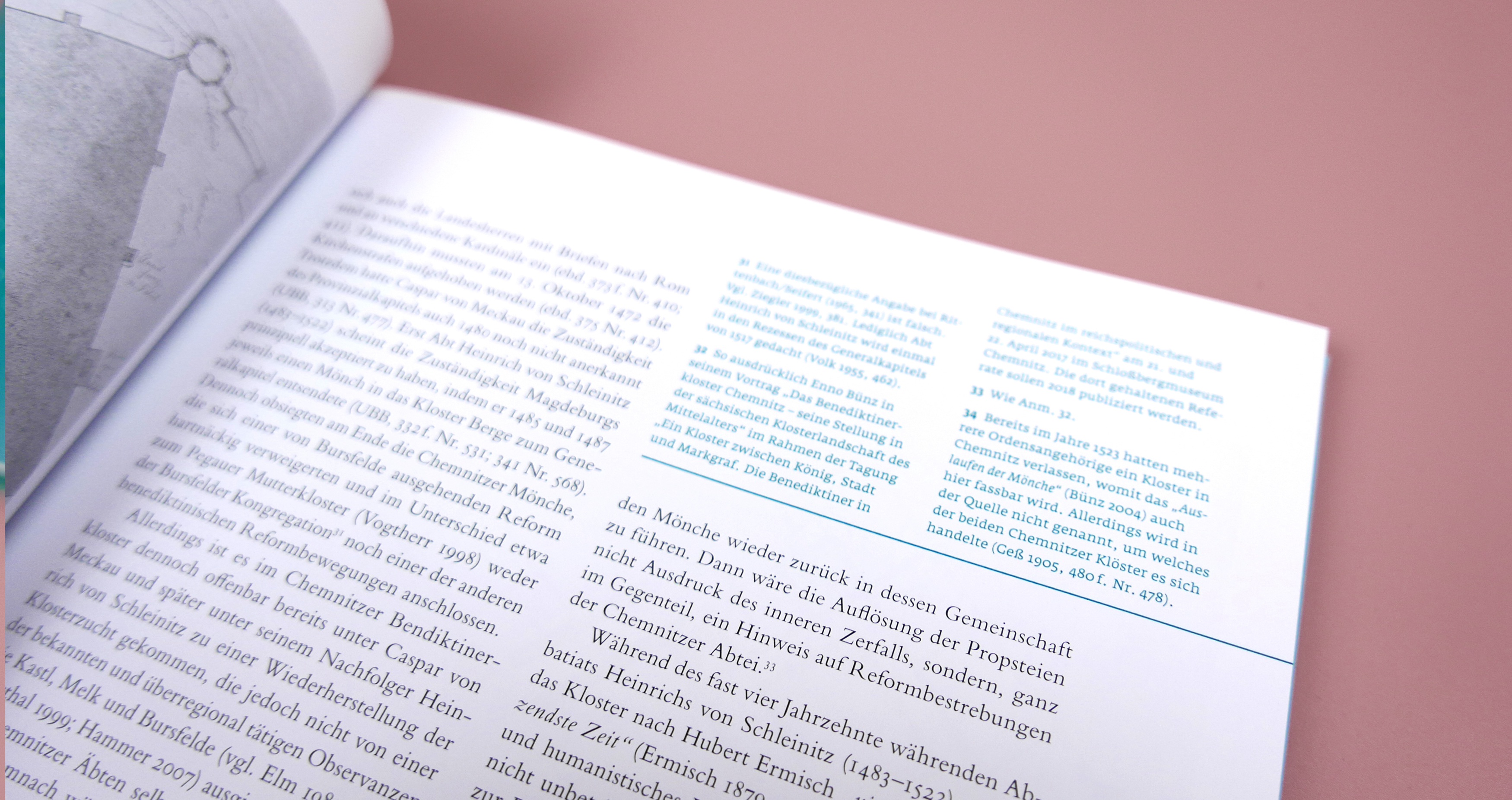 Anlässlich des Chemnitzer Stadtjubiläums 2018 wurden mit diesem Buchprojekt die Grabungen im ehemaligen Benediktinerkloster vorgestellt. Die darin enthaltenen wissenschaftlichen Auswertungen stellen einen wichtigen Beitrag zur Stadtgeschichte dar. Mit klarem Satz, dezenten grafischen Elementen und feinen Details wie z. B. den petrolfarbenen springenden Fußnoten genügt die Gestaltung den Anforderungen wissenschaftlicher Strenge und erweckt gleichzeitig das Interesse eines breiteren Publikums. Hardcover, Vorsatzpapier Surbalin, Format 21,5/28,5cm, 168 Seiten.