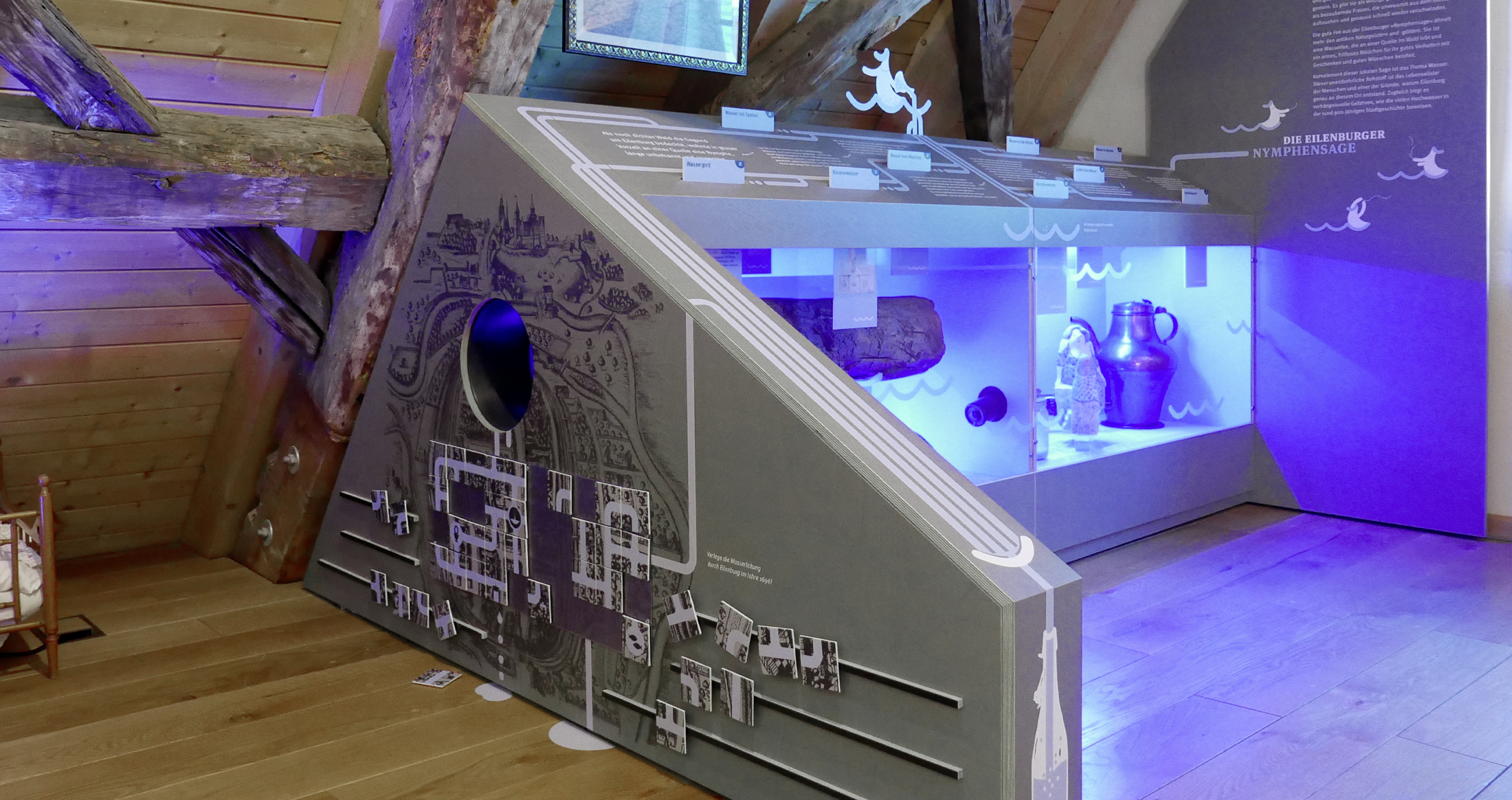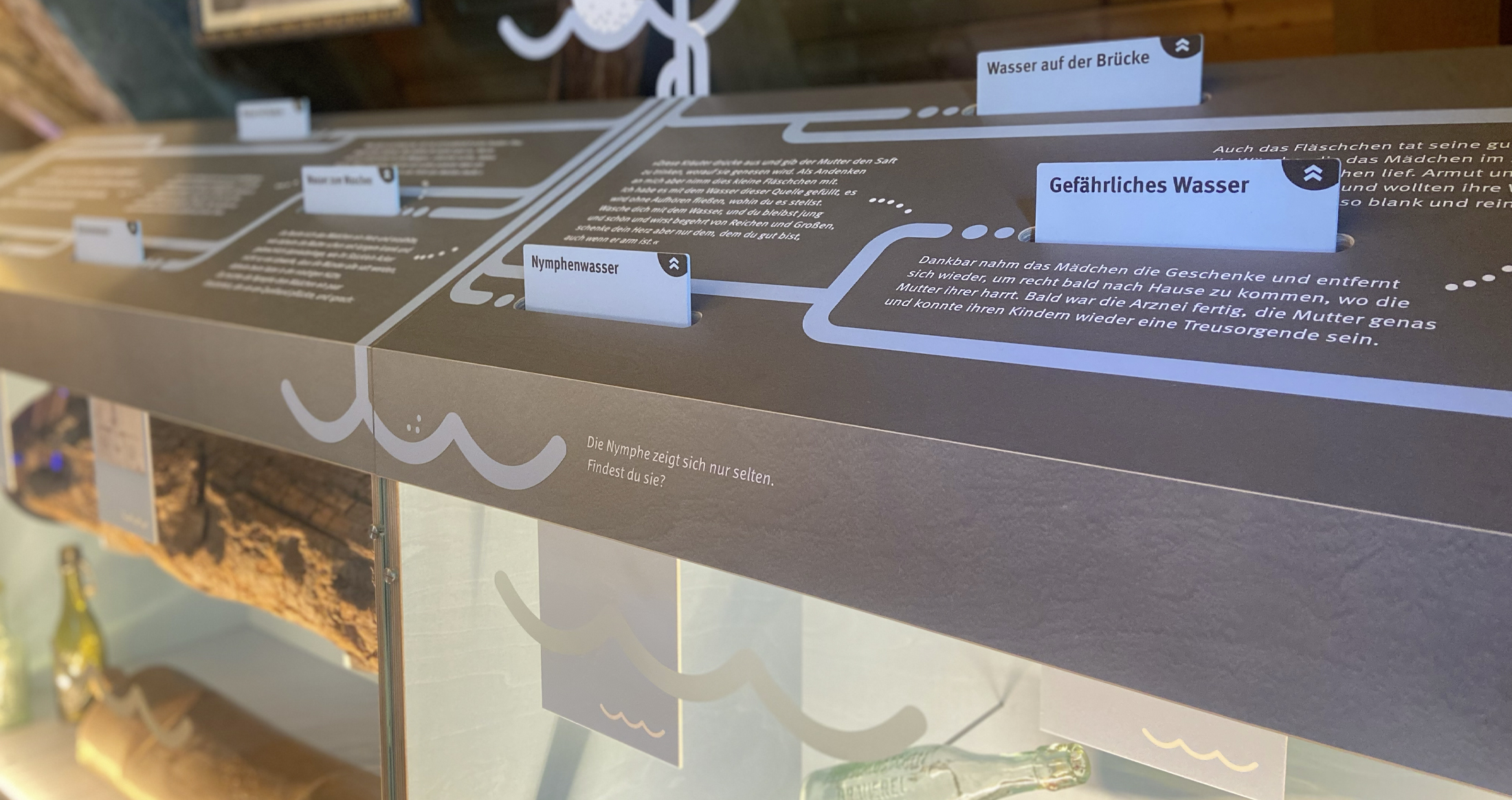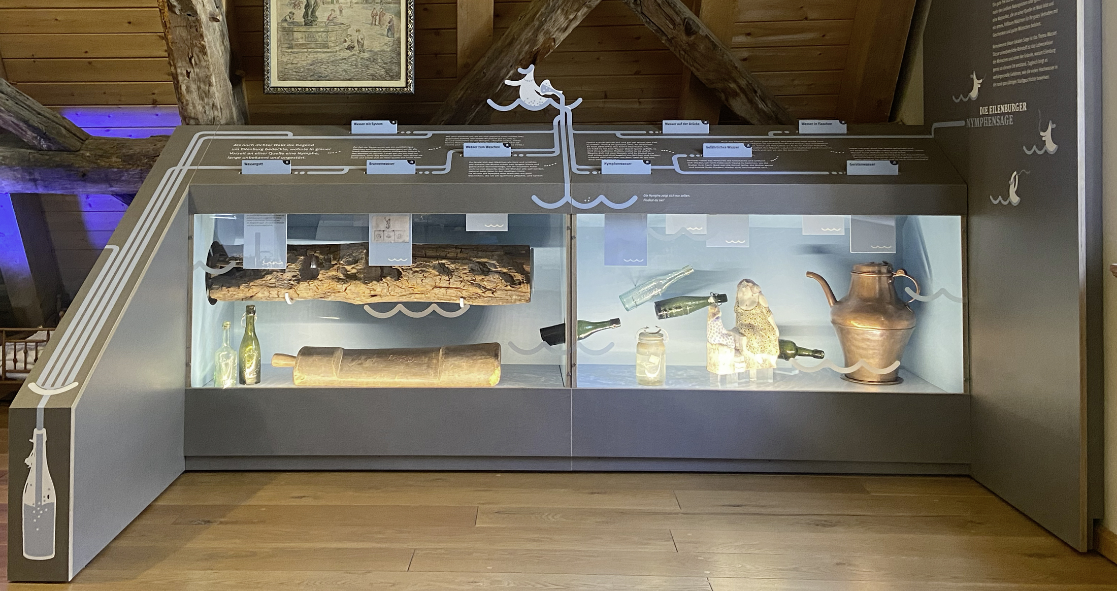 Die Vitrine erzählt von der Eilenburger Nymphensage und gleichzeitig der Geschichte des Wassers in der Stadt, beide sind eng miteinander verbunden. Die Gestaltung folgt dem Lauf des Wassers aus der Flasche der Nymphe bis zur Abfüllung in Mineralwasserflaschen durch historische Wasserohre. Doch es gibt Havarien und Lecks. Die Exponate schweben in einer blau pulsierend ausgeleuchteten und von Geräuschen untermalten Unterwasserwelt. Hier versteckt sich die scheue Nymphe. Die Vitrine ist Teil des schrittweisen Umbaus der Dauerausstellung im Obergeschoss des Museums und bautechnisch eine Spiegelung der 2021 umgesetzen Heinzelmännchenvitrine.