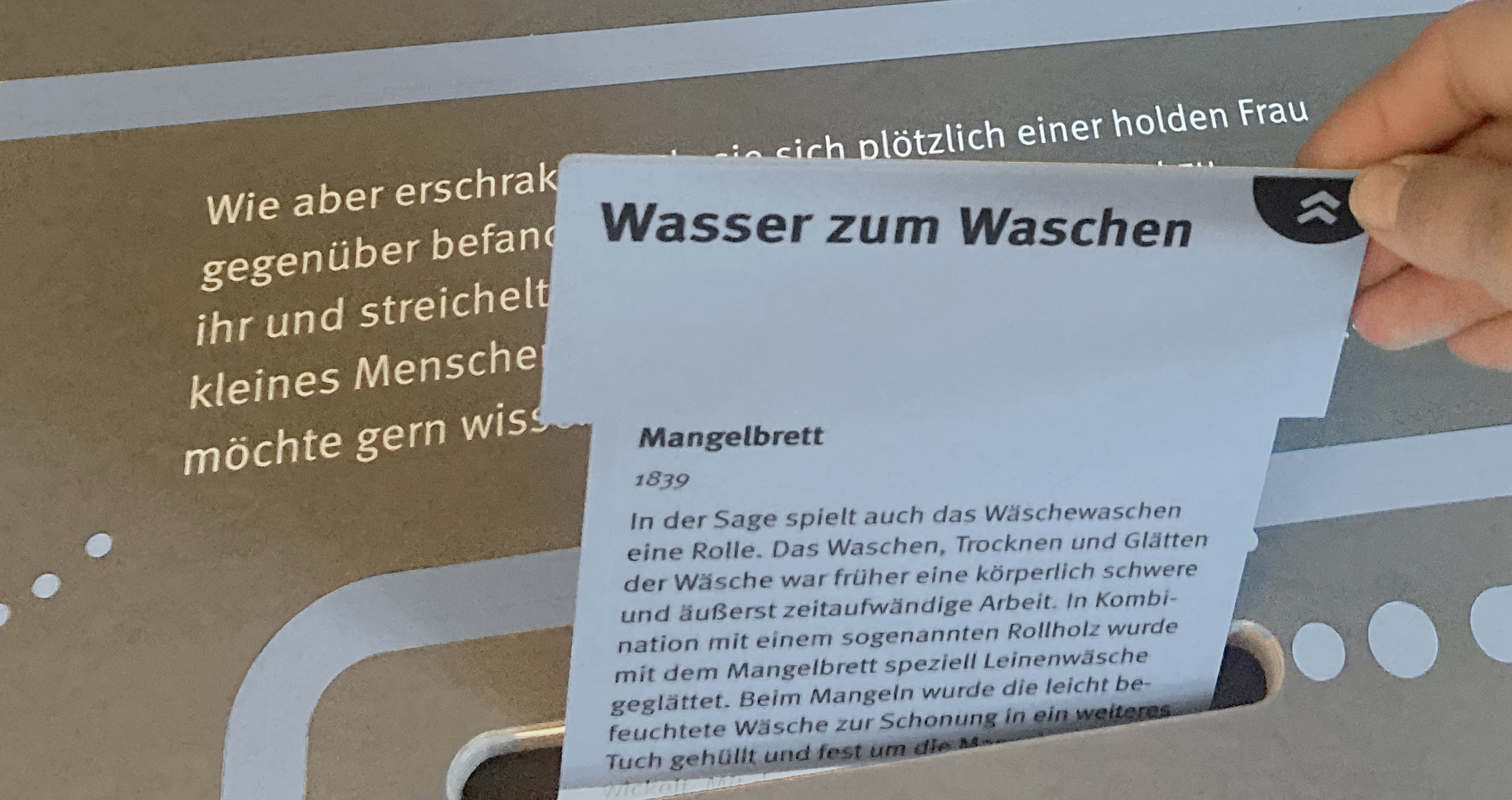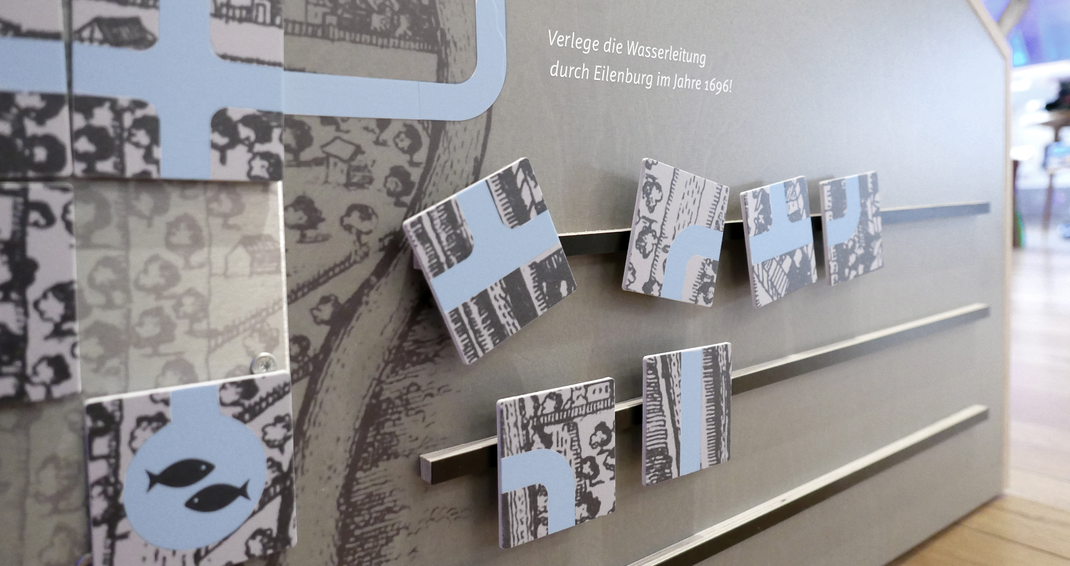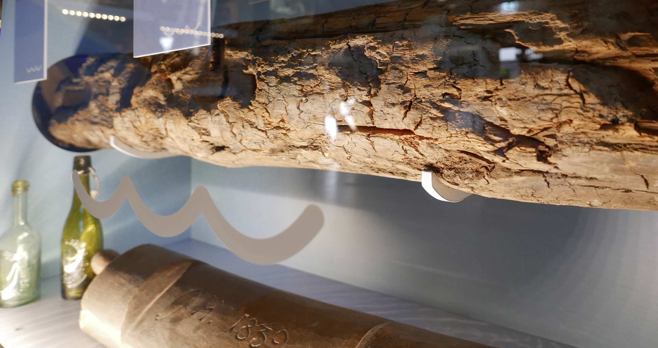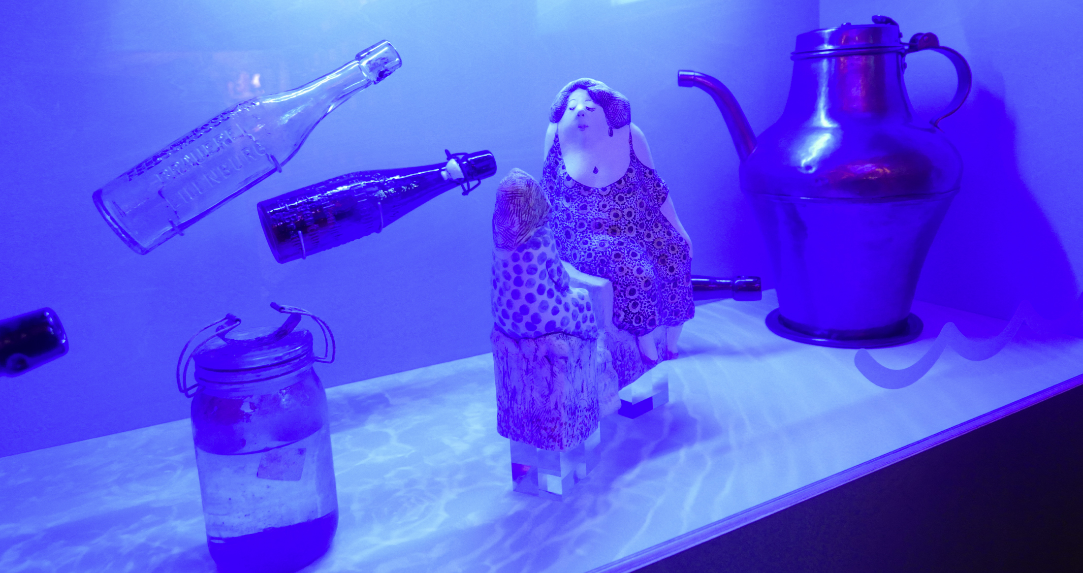 Die Vitrine erzählt von der Eilenburger Nymphensage und gleichzeitig der Geschichte des Wassers in der Stadt, beide sind eng miteinander verbunden. Die Gestaltung folgt dem Lauf des Wassers aus der Flasche der Nymphe bis zur Abfüllung in Mineralwasserflaschen durch historische Wasserohre. Doch es gibt Havarien und Lecks. Die Exponate schweben in einer blau pulsierend ausgeleuchteten und von Geräuschen untermalten Unterwasserwelt. Hier versteckt sich die scheue Nymphe. Die Vitrine ist Teil des schrittweisen Umbaus der Dauerausstellung im Obergeschoss des Museums und bautechnisch eine Spiegelung der 2021 umgesetzen Heinzelmännchenvitrine.