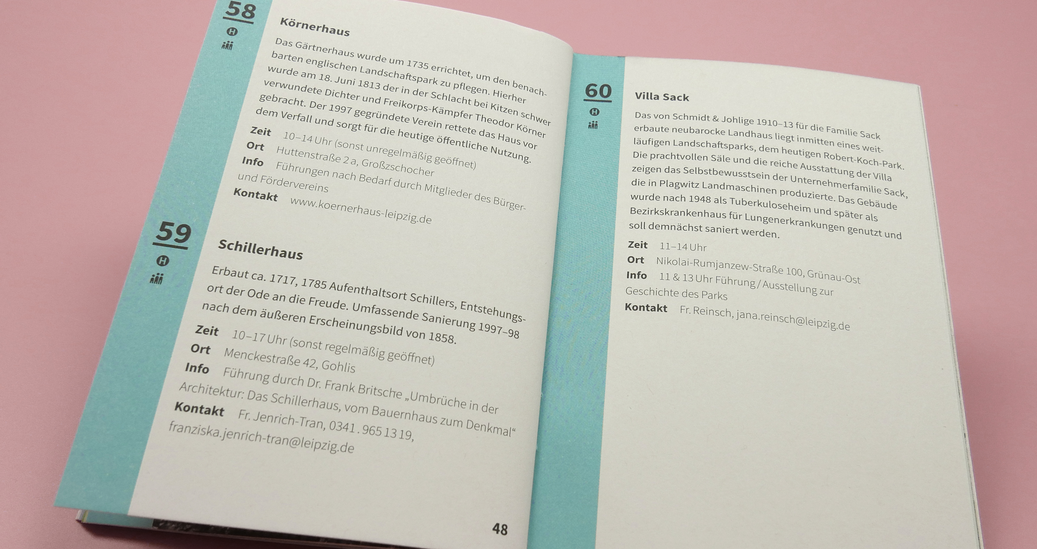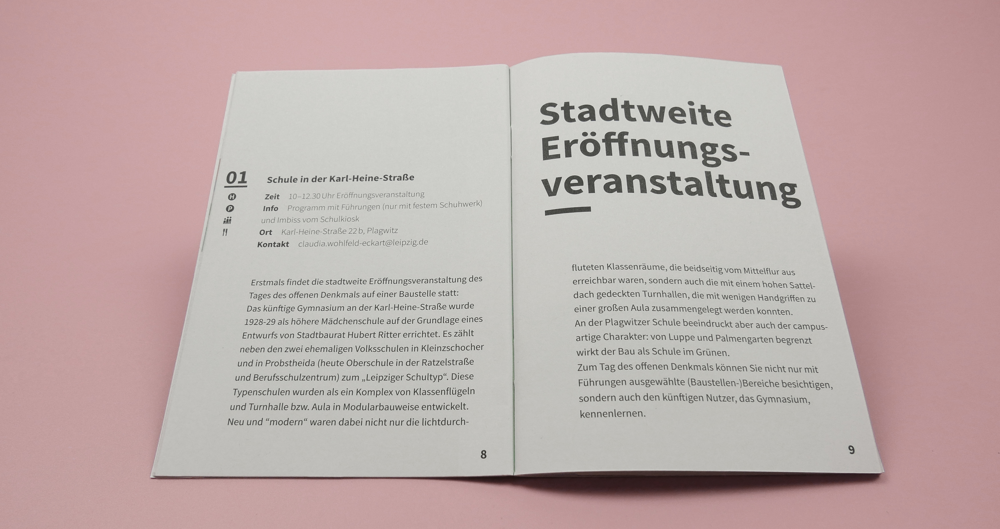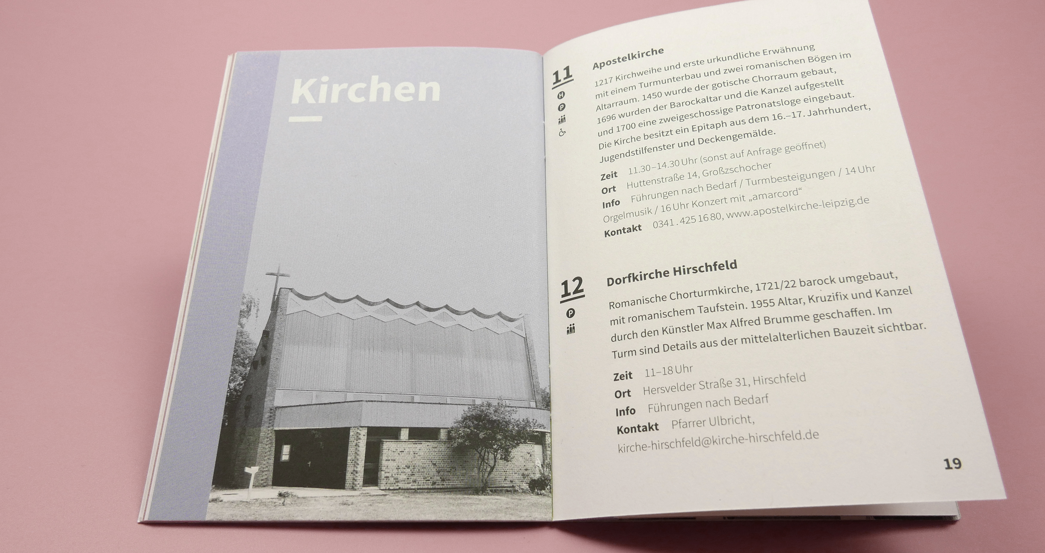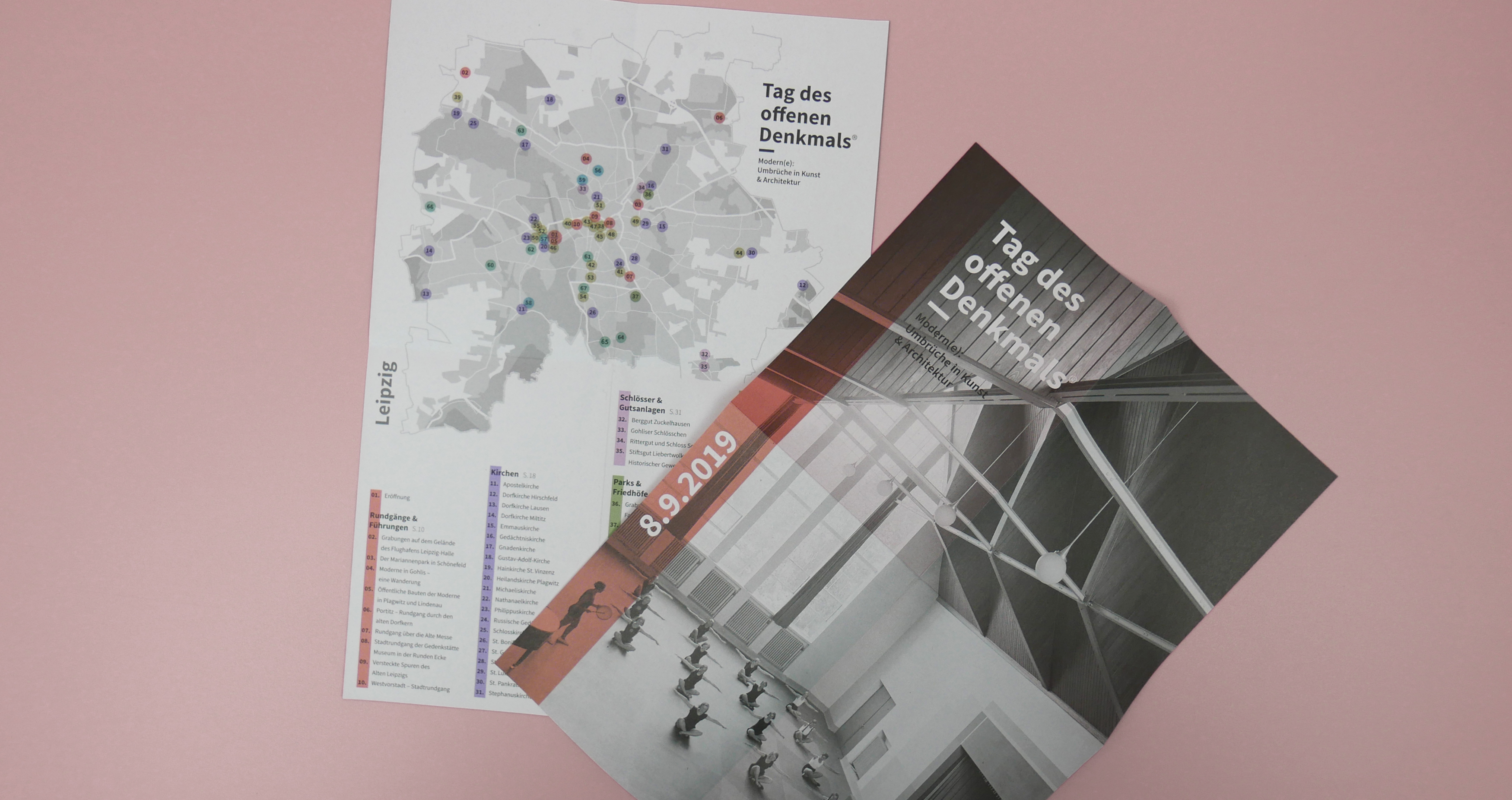 Jedes Jahr im September öffnen Denkmäler bundesweit ihre Türen. In Leipzig entstand hierzu eine kleine Begleitbroschüre, die dem Besucher gut strukturiert und klar gestaltet die wichtigsten Angaben zu den einzelnen Orten aufzeigt – samt herausnehmbarer Übersichtskarte.
