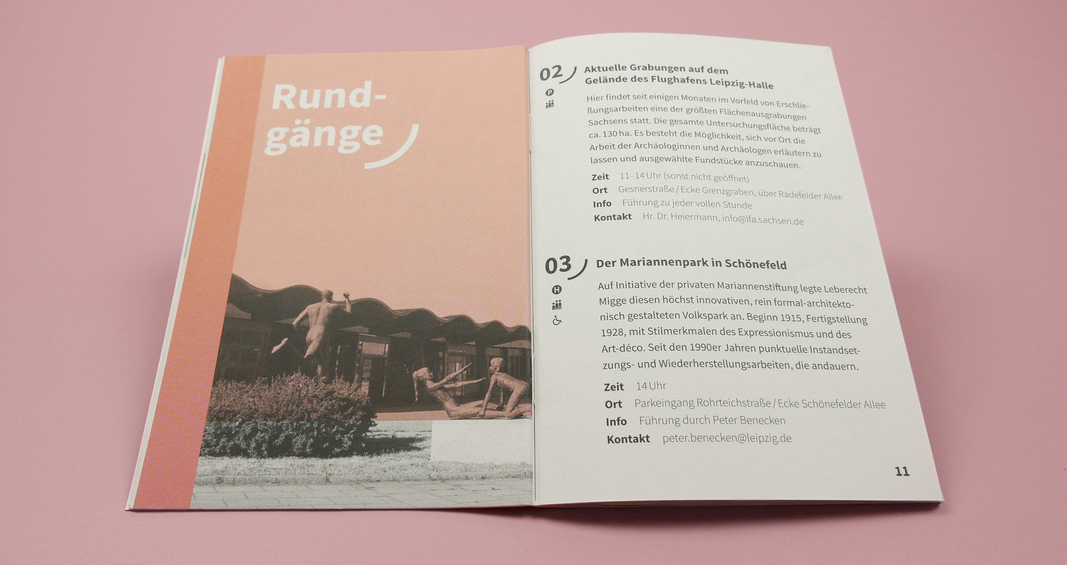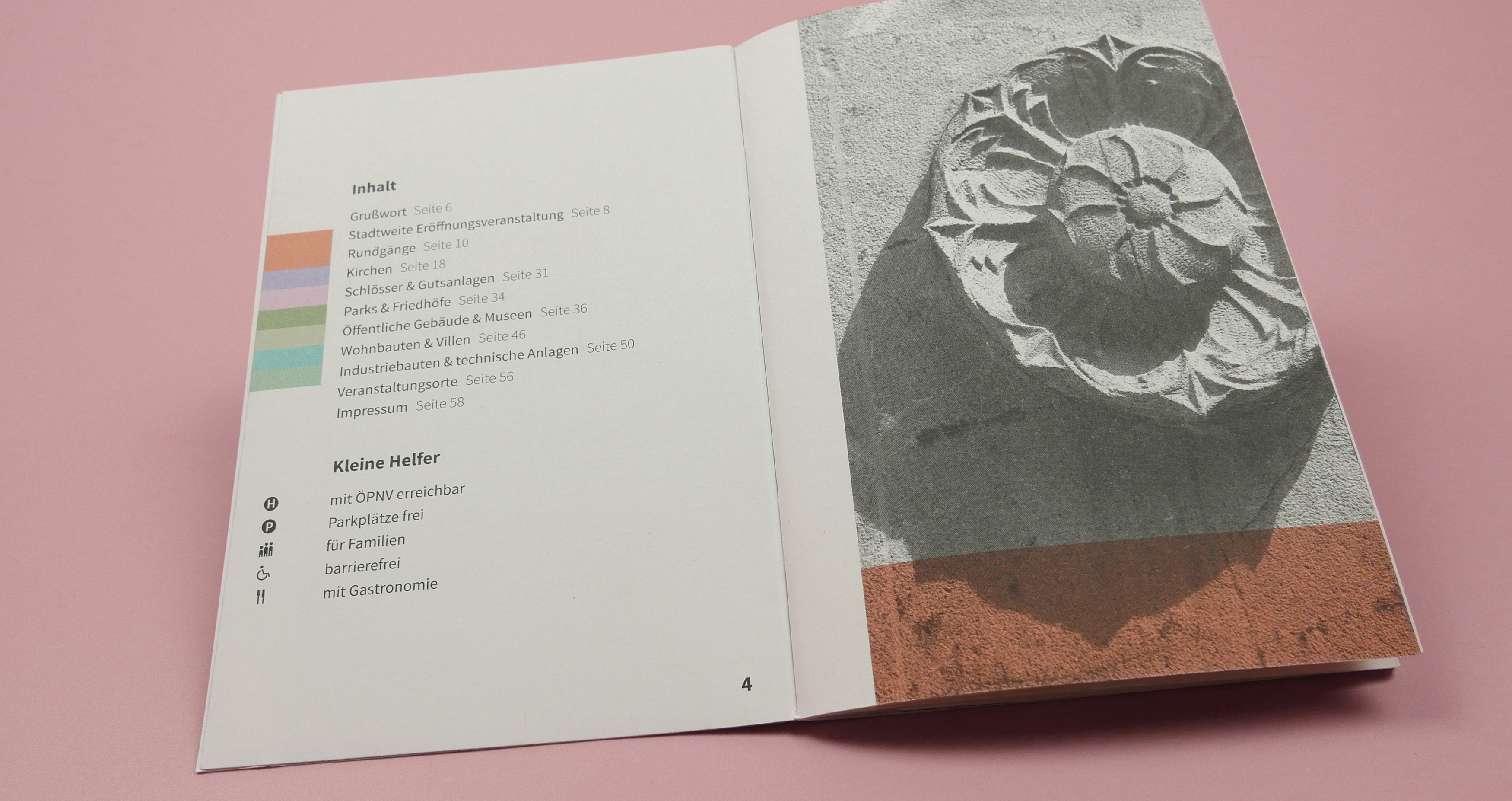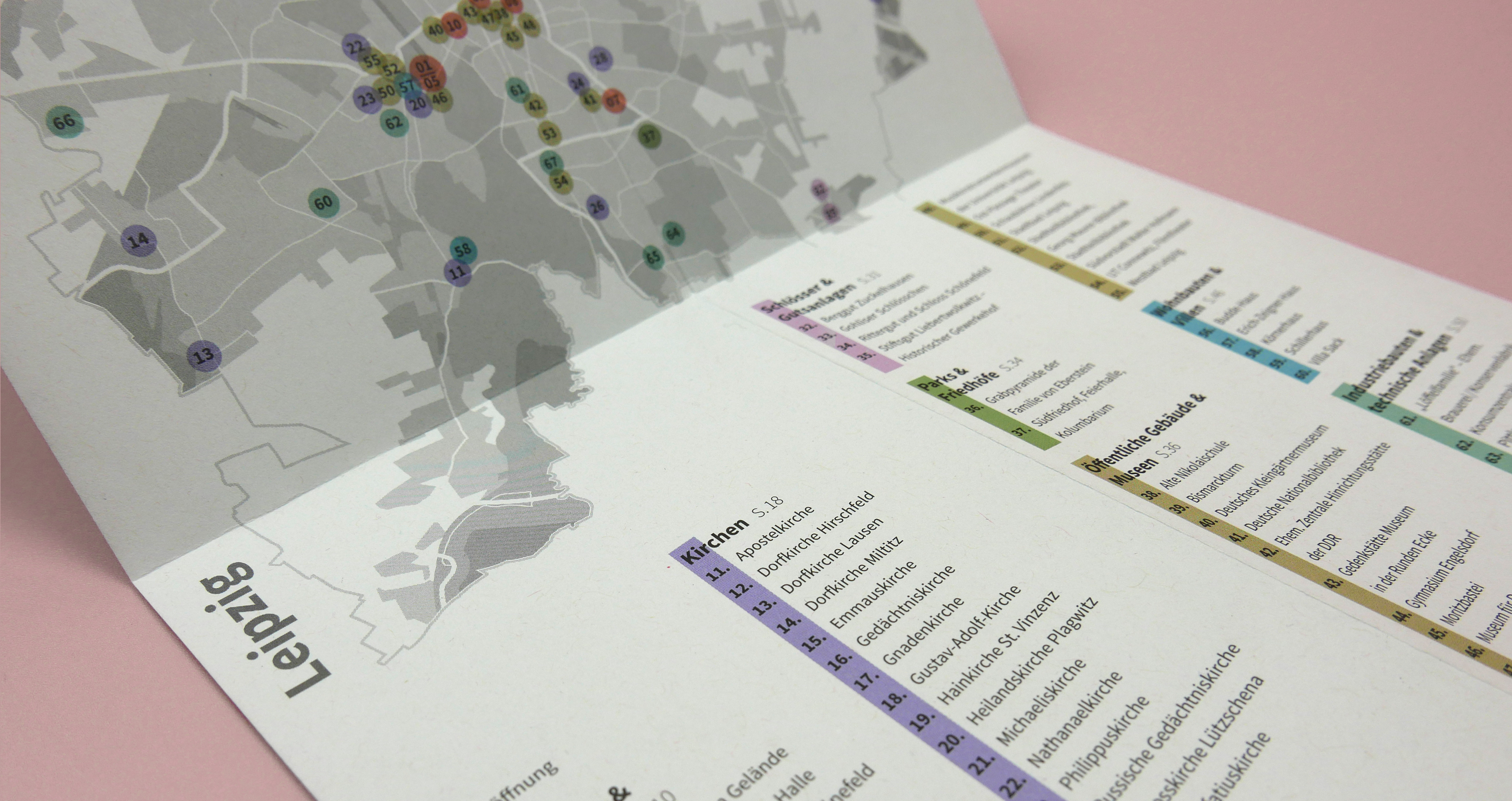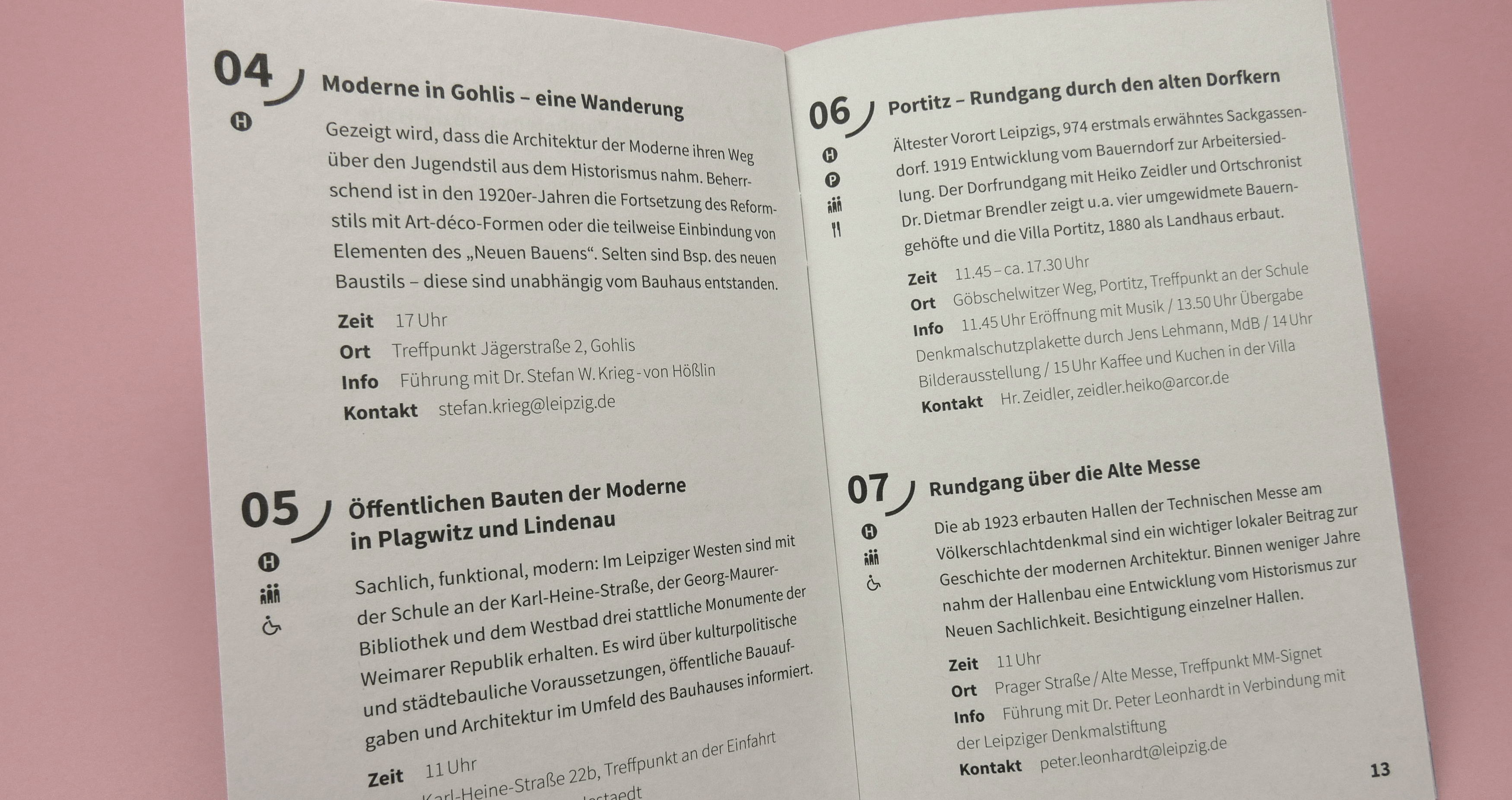 Jedes Jahr im September öffnen Denkmäler bundesweit ihre Türen. In Leipzig entstand hierzu eine kleine Begleitbroschüre, die dem Besucher gut strukturiert und klar gestaltet die wichtigsten Angaben zu den einzelnen Orten aufzeigt – samt herausnehmbarer Übersichtskarte.